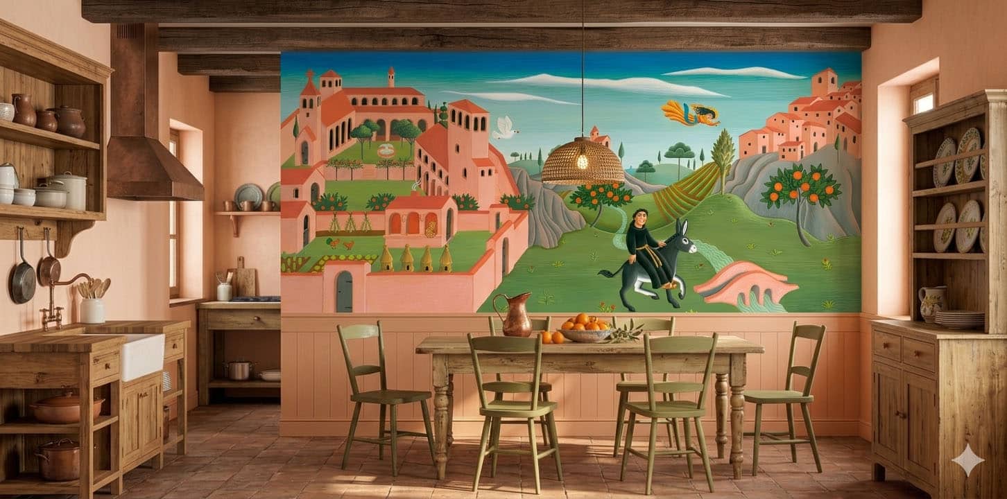 From the earthy terracotta of the Tuscan village rooftops to the soothing sage greens of the orchards, the colours in this wall mural will complement natural wood textures and warm “light peach” interior tones perfectly.