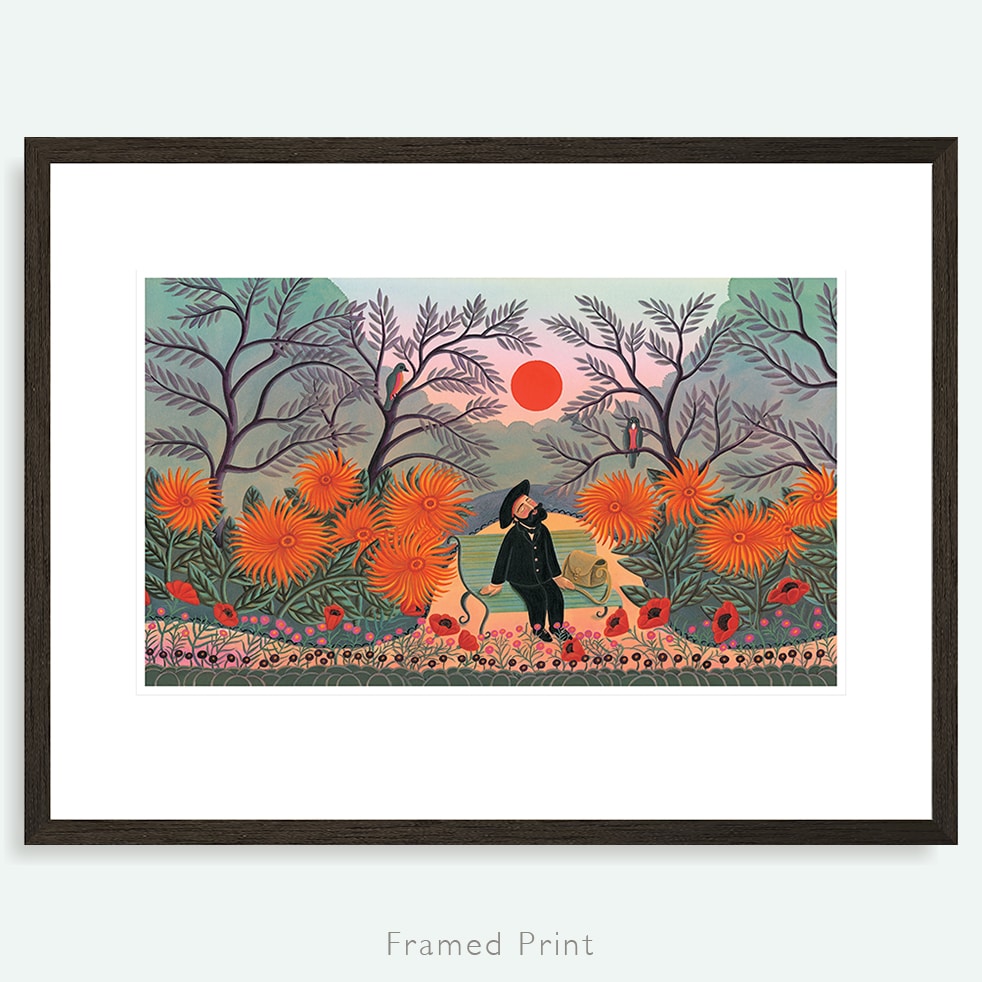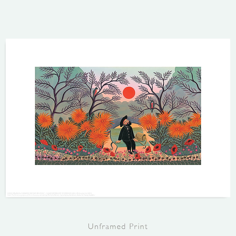 In this beautiful print, Amanda Hall illustrates the author’s passage in the book: “Because when he strolls through the parks of Paris, it’s like the flowers open their hearts, the trees spread their arms, and the sun is a blushing ruby, all for him.” We see Henri Rousseau in a dream-like reverie in a Parisian park, surrounded by huge flowers as the sun goes down, as imagined by the illustrator.